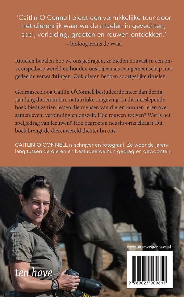 'Wilde rituelen' van Caitlin O'Connell bevat tien lessen die mensen van dieren kunnen leren over samenleven, verbinding en onszelf. Het is een fascinerend boek dat de dierenwereld dichter bij ons brengt. O’Connell vertelt welke rituelen dieren volgen als ze elkaar begroeten, verleiden of als ze rouwen. Het gemeenschapsgevoel van zebra’s, olifanten en chimpansees leert ons wat in onze op het individu gerichte samenleving hard nodig is. Dieren leren ons te leven. De auteur woonde jarenlang tussen de dieren: Jane Goodall meets Frans de Waal. 'Caitlin O’Connell biedt een verrukkelijke tour door het dierenrijk waar we de rituelen in gevechten, spel, verleiding, groeten en rouwen ontdekken.' – Frans de Waal