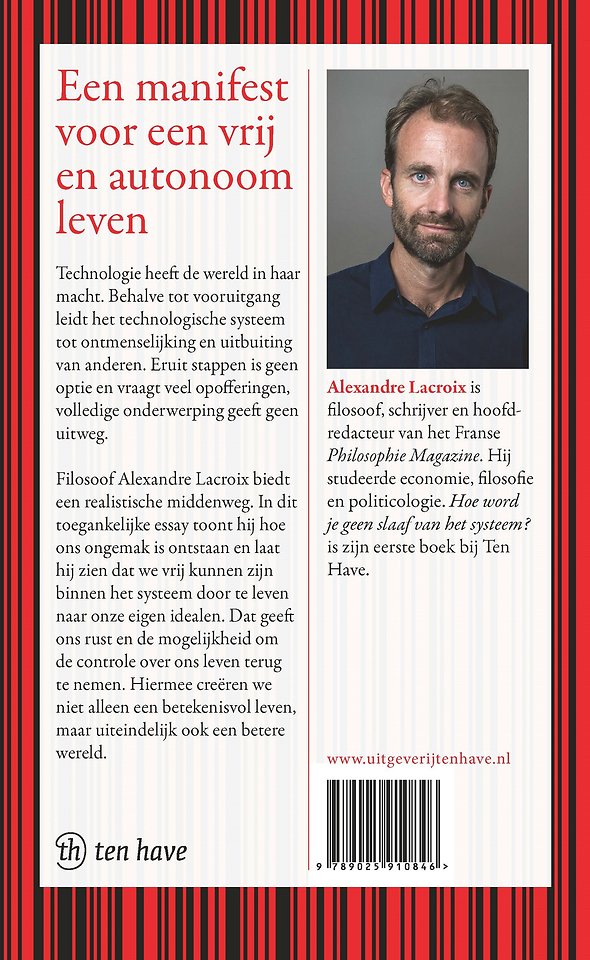 Alexandre Lacroix (1975) is filosoof, schrijver en hoofdredacteur van het Franse Philosophie Magazine. Hij studeerde economie, filosofie en politicologie. Hoe word je geen slaaf van het systeem is zijn eerste boek bij Ten Have.