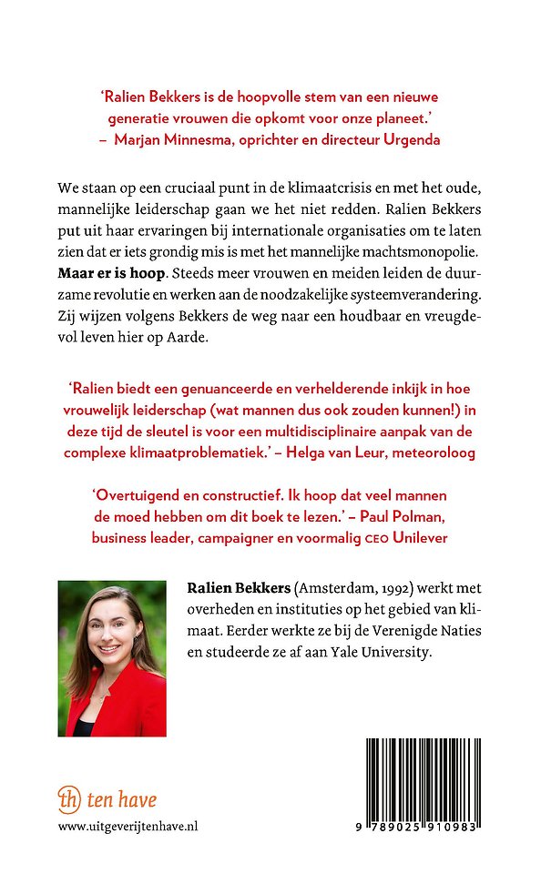 We staan op een cruciaal punt in de klimaatcrisis en met het oude, mannelijke leiderschap gaan we het niet redden. Ralien Bekkers put uit haar ervaringen bij internationale organisaties, waaronder de VN, om te laten zien dat er iets grondig mis is met het mannelijke machtsmonopolie.