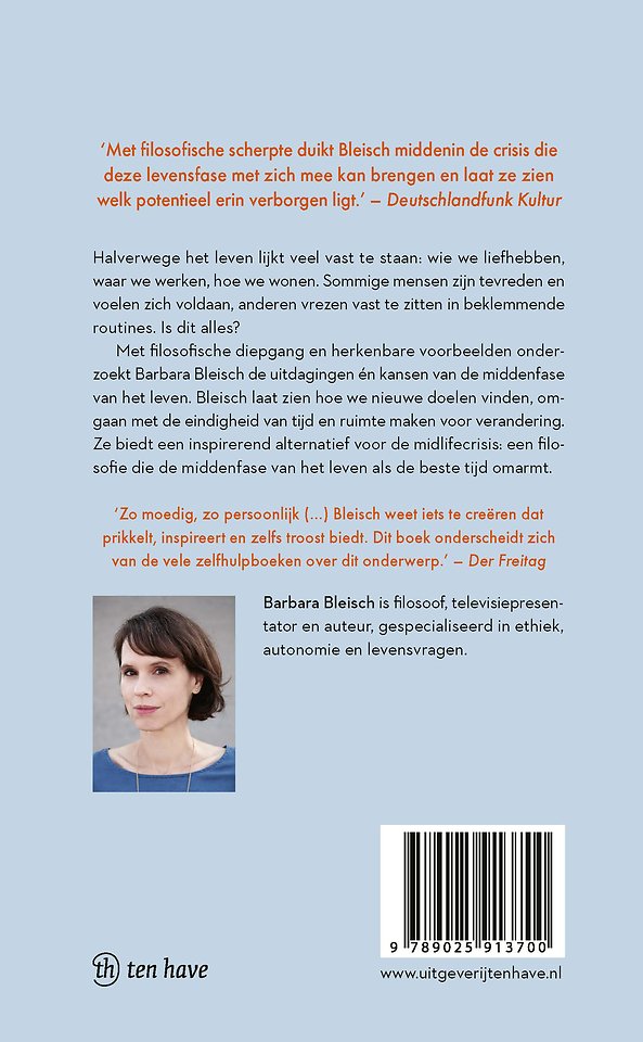 Met filosofische diepgang en alledaagse voorbeelden onderzoekt Barbara Bleisch hoe we nieuwe doelen vinden en omgaan met het besef dat tijd en kansen beperkt zijn. Ze biedt een inspirerend alternatief voor de midlifecrisis: een filosofie die de middenfase van het leven als de beste tijd omarmt.