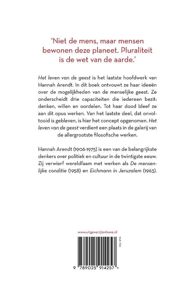 'Het leven van de geest' is het laatste hoofdwerk van Hannah Arendt. In dit boek ontvouwt ze haar ideeën over de mogelijkheden van de menselijke geest. Ze onderscheidt drie capaciteiten die iedereen bezit: denken, willen en oordelen. Tot haar dood bleef ze aan dit opus werken. Van het laatste deel, dat onvoltooid is gebleven, is hier het concept opgenomen. Van de hardbackeditie van dit boek werden meer dan 7.000 exemplaren verkocht.