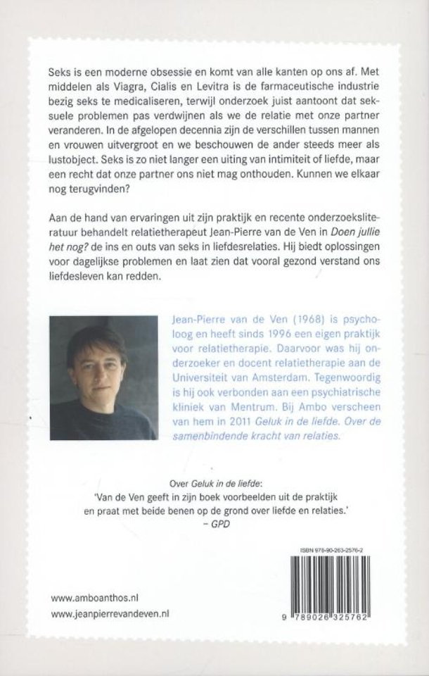 Seks is zo niet langer een uiting van intimiteit of liefde, maar een recht dat onze partner ons niet mag onthouden. Kunnen we elkaar nog terugvinden? In Doen jullie het nog? betoogt relatietherapeut Jean-Pierre van de Ven dat we obsessief bezig zijn met seks in onze relatie. Niet alleen onze relatie, ook onze identiteit hangt af van een goed seksleven.