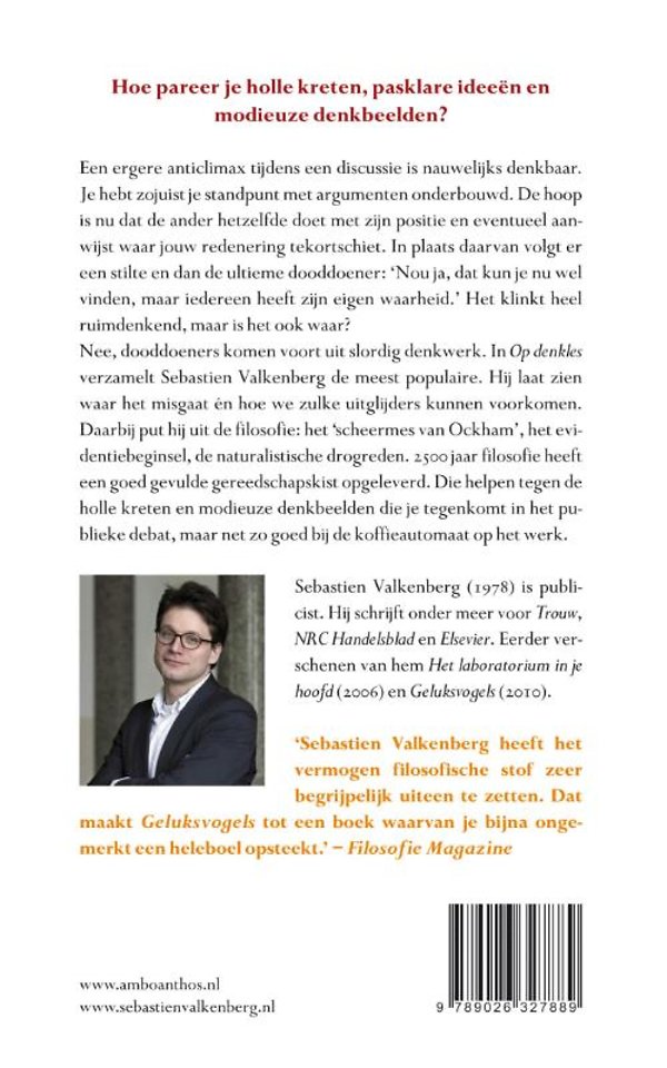 Nee, dooddoeners komen voort uit slordig denkwerk. In 'Op denkles' verzamelt Sebastien Valkenberg de meest populaire. Hij laat zien waar het misgaat en hoe we zulke uitglijders kunnen voorkomen. Daarbij put hij uit de filosofie: het 'scheermes van Ockham', het evidentiebeginsel, de naturalistische drogreden. 2500 jaar filosofie heeft een goed gevulde gereedschapskist opgeleverd. Die helpen tegen de holle kreten en modieuze denkbeelden die je tegenkomt op in het publieke debat, maar net zo goed bij de koffieautomaat op het werk.