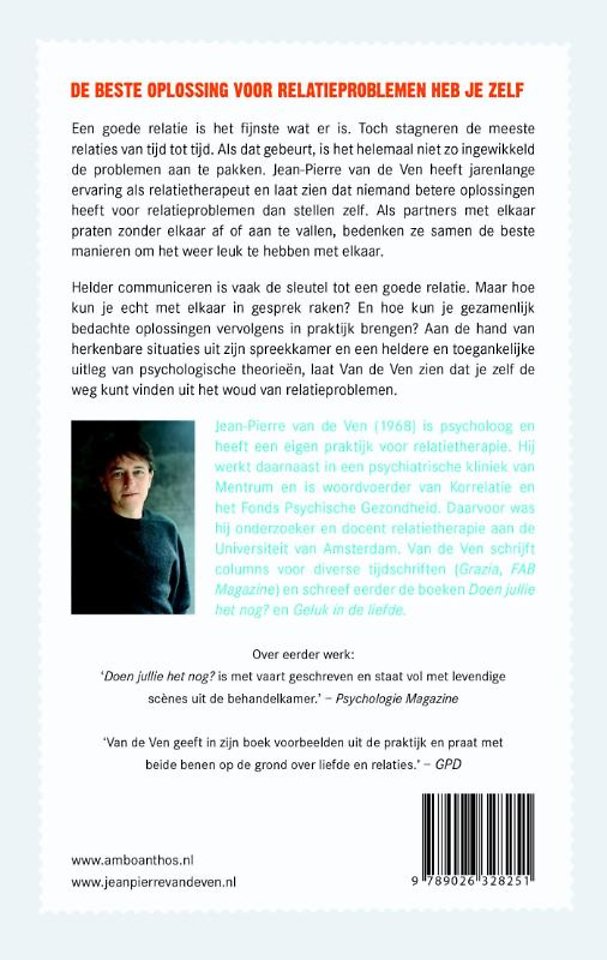 Psycholoog Jean-Pierre van de Ven is Nederlands bekendste relatietherapeut. Hij schreef eerder al drie boeken over omgaan met relatieproblemen (Ruzie met je partner, Omgaan met relatieproblemen en Zo erg is het nou ook weer niet) en columns in de Volkskrant over zijn psychologenpraktijk.