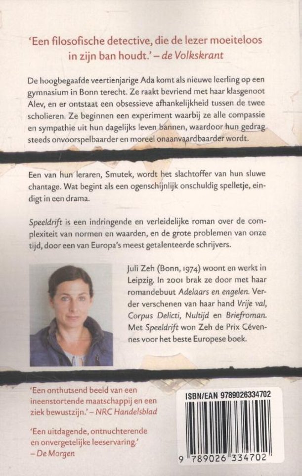 In 'Speeldrift' van Juli Zeh komt de hoogbegaafde veertienjarige Ada als nieuwe leerling op een gymnasium in Bonn terecht. Ze raakt bevriend met haar klasgenoot Alev, en er ontstaat een obsessieve afhankelijkheid tussen de twee scholieren. Ada en Alev beginnen een experiment waarbij ze alle compassie en sympathie uit hun dagelijks leven bannen, waardoor hun gedrag steeds onvoorspelbaarder en moreel onaanvaardbaarder wordt. Een van hun leraren, Smutek, wordt het slachtoffer van hun sluwe chantage. Wat begint als een ogenschijnlijk onschuldig spelletje, eindigt in een drama.