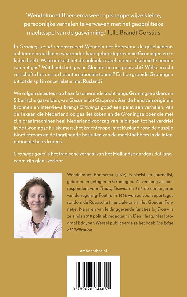 In Gronings goud reconstrueert Wendelmoet Boersema de geschiedenis achter de barsten en de breuken waaronder haar geboorteprovincie Groningen zo te lijden heeft. Waarom kost het de politiek zoveel moeite afscheid te nemen van het gas? Wat heeft het gas uit Slochteren ons gebracht? Welke macht verschafte het gas ons op het internationale toneel? En hoe groeide Groningen uit tot de spil in onze relatie met Rusland? We volgen de auteur op haar fascinerende tocht langs Groningse akkers en Siberische gasvelden, van Gasunie tot Gazprom.