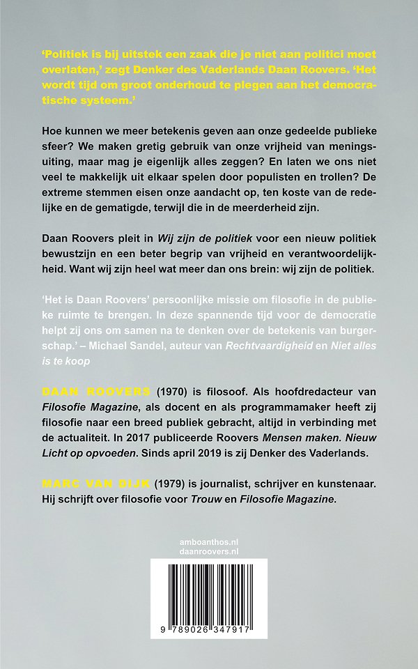 Daan Roovers pleit in Wij zijn de politiek voor een nieuw politiek bewustzijn en een beter begrip van vrijheid en verantwoordelijkheid. Want wij zijn heel wat meer dan ons brein: wij zijn de politiek.