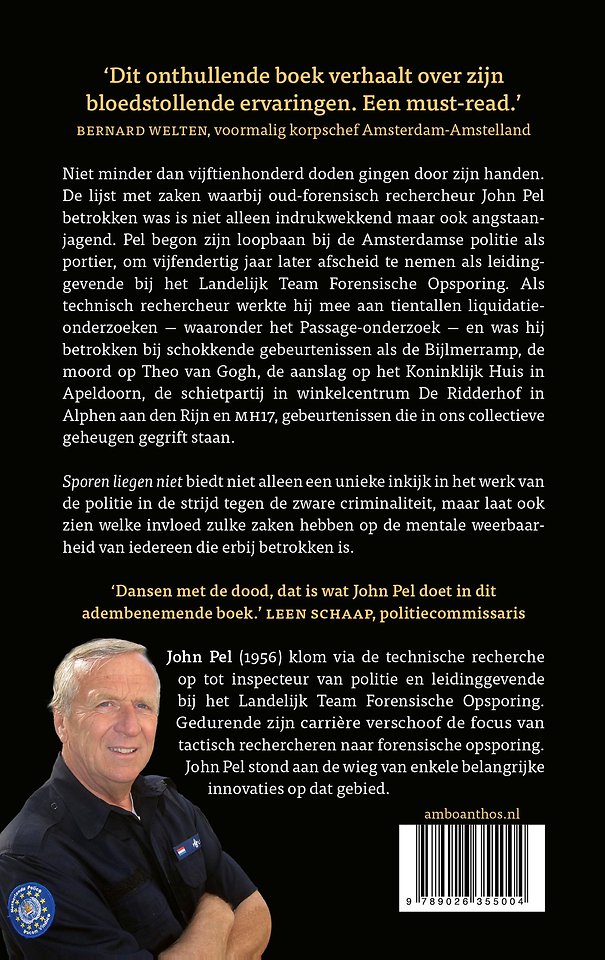 Sporen liegen niet van John Pel biedt een unieke inkijk in het werk van een forensisch rechercheur in de strijd tegen de zware criminaliteit. Niet minder dan vijftienhonderd doden gingen door zijn handen. De lijst met zaken waarbij oud-forensisch rechercheur John Pel in zijn carrière betrokken was, is niet alleen indrukwekkend maar ook angstaanjagend.
