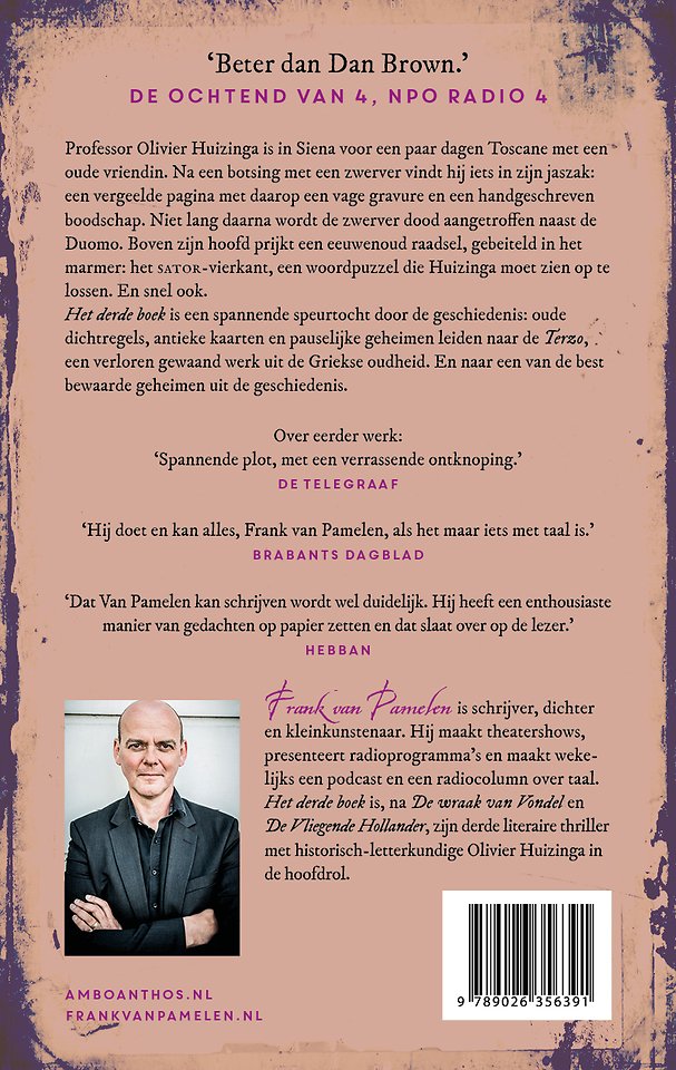 De thriller Het derde boek van Frank van Pamelen, het derde deel in de Huizinga-serie, is een spannende speurtocht door de geschiedenis vol oude dichtregels, antieke kaarten en pauselijke geheimen.