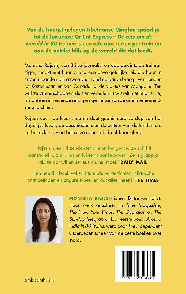 Toen Monisha Rajesh haar plan aankondigde voor De reis om de wereld in 80 treinen werd ze met grote ogen aangekeken, maar niet lang daarna stippelde ze zorgvuldig een route uit over de mooiste spoorwegen ter wereld. Zo begon Monisha Rajesh samen met haar vriend aan een onvergetelijke reis die hen van Londen naar de uitgestrekte vlaktes van Mongolië bracht. Van Noord-Korea naar Canada, Kazachstan en nog verder: in zeven maanden bijna twee keer rond de aarde. En terwijl ze vriendschappen sloten en verhalen uitwisselden met hilarische, irritante en innemende reizigers, genoten ze van de adembenemendste uitzichten.