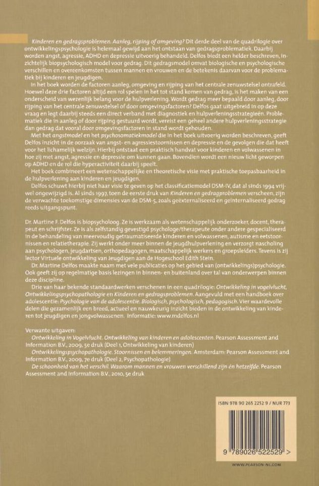 Kinderen en gedragsproblemen. Aanleg, rijping of omgeving? Dit derde deel van de quadrilogie over ontwikkelingspsychologie is helemaal gewijd aan het ontstaan van gedragsproblematiek. Daarbij worden angst, agressie, ADHD en depressie uitvoerig behandeld. Delfos biedt een helder beschreven, inzichtelijk biopsychologisch model voor gedrag. Dit gedragsmodel omvat biologische en psychologische verschillen en overeenkomsten tussen mannen en vrouwen en de betekenis daarvan voor de problematiek bij kinderen en jeugdigen.