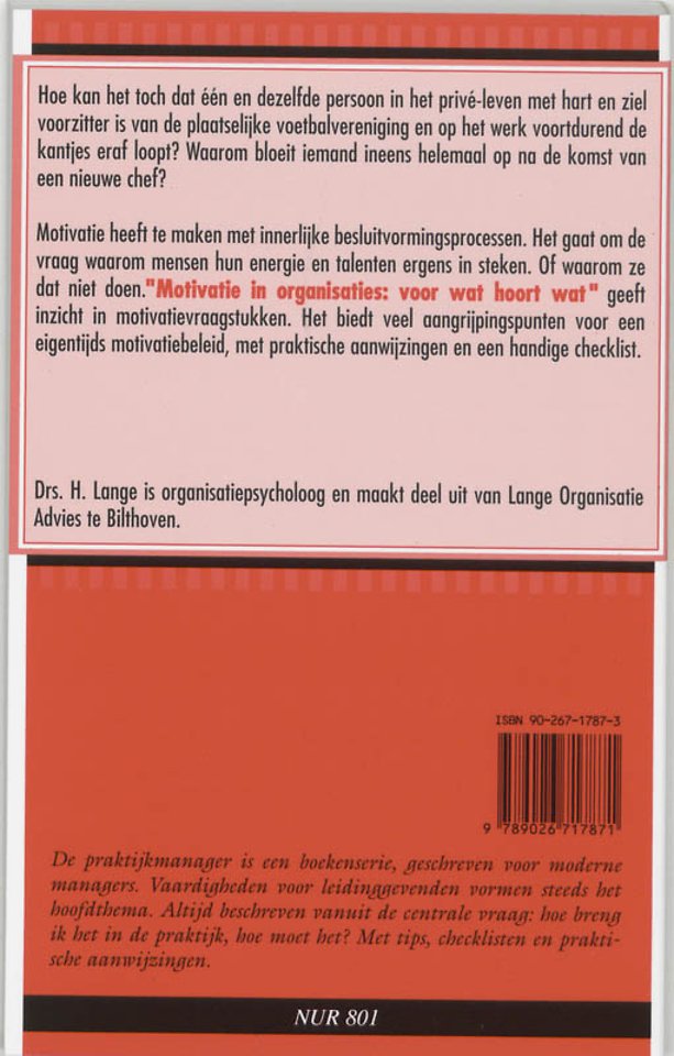 Hoe kan het toch dat een en dezelfde persoon in het privé-leven met hart en ziel voorzitter is van de plaatselijke voetbalvereniging en op het werk voortdurend de kantjes eraf loopt? Waarom bloeit iemand ineens helemaal op na de komst van een nieuwe chef? Motivatie heeft te maken met innerlijke besluitvormingsprocessen. Het gaat om de vraag waarom mensen hun energie en talenten ergens in steken. Of waarom ze dat niet doen. 'Motivatie in organisaties: voor wat hoort wat' geeft inzicht in motivatievraagstukken. Het biedt veel aangrijpingspunten voor een eigentijds motivatiebeleid, met praktische aanwijzingen en een handige checklist.