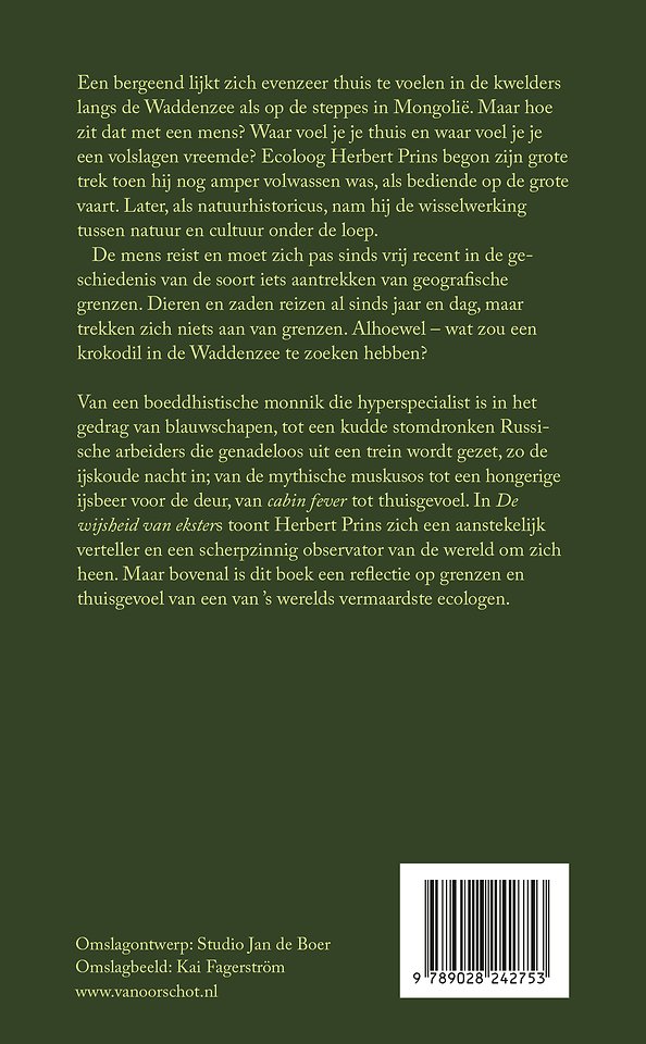 Van een boeddhistische monnik die hyperspecialist is in het gedrag van blauwschapen, tot een kudde stomdronken Russische arbeiders die genadeloos uit een trein wordt gezet, zo de ijskoude nacht in; van de mythische muskusos tot een hongerige ijsbeer voor de deur, van cabin fever tot thuisgevoel. In De wijsheid van eksters toont Herbert Prins zich een aanstekelijk verteller en een scherpzinnig observator van de wereld om zich heen. Maar bovenal is dit boek een reflectie op grenzen en thuisgevoel van een van ’s werelds vermaardste ecologen.