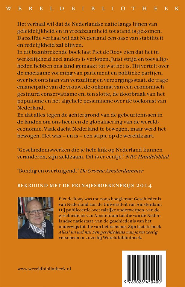 In dit baanbrekende boek laat Piet de Rooy zien dat het in werkelijkheid heel anders is verlopen. Niet vreedzaamheid en geleidelijkheid, maar conflicten, strijd en toevalligheden hebben ons land gemaakt tot wat het is. Hij plaatst de totstandkoming van Nederland in het kader van de wereldgeschiedenis en laat zien dat de nationale ontwikkelingen niet zouden hebben plaatsgevonden zonder de grote bewegingen in de wereld: vaak dacht Nederland te bewegen, maar werd bewogen. Het was - en is - een stipje op de wereldkaart.