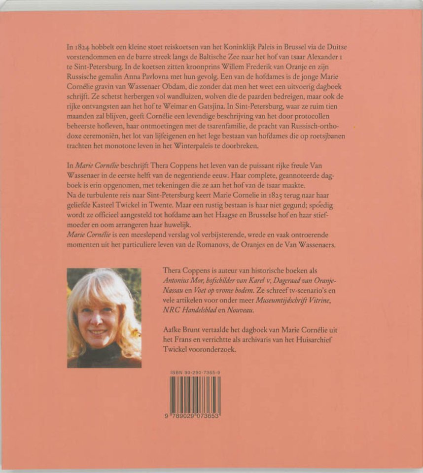 In 1824 hobbelt een kleine stoet reiskoetsen van het Koninklijk Paleis te Brussel via de Duitse vorstendommen door Polen, Lijfland en de barre streek langs de Baltische Zee naar het hof van tsaar Alexander I te Sint-Petersburg. In de koetsen zitten kroonprins Willem Frederik van Oranje en zijn Russische gemalin Anna Pavlova met hun gevolg.Een der hofdames is de jonge Marie Cornélie gravin van Wassenaer Obdam die, zonder dat men het weet, uitvoerige dagboeken schrijft. Ze schetst herbergen vol wandluizen, wolven die de paarden bedreigen maar ook de rijke ontvangst aan het hof te Weimar. In Sint-Petersburg, waar ze ruim tien maanden blijven, geeft Cornélie een levendige beschrijving van het door etiquette beheerste hofleven, haar ontmoetingen met schrijvers en componisten, de pracht van Russisch-orthodoxe ceremoniën, het lot der lijfeigenen en het lege bestaan der hofdames die op roetsjbanen trachten het monotone leven in het Winterpaleis te doorbreken.Cornélies reisdagboeken bleken door Alfred Graaf zu Solms Sonnenwalde op Kasteel Weldam bewaard te worden. Aafke Brunt, archivaris van het Huisarchief Twickel, vertaalde ze uit het Frans en verrichtte vooronderzoek. Thera Coppens schreef het levensverhaal van de puissant rijke Cornélie, dat zich afspeelt in een grillig tijdperk: Cornélie wordt geboren ten tijde van de Bataafse Republiek, groeit op onder het bewind van koning Lodewijk Napoleon, ziet keizer Napoleon over het Lange Voorhout schrijden en wordt ten slotte trouw onderdaan van de koningen Willem I en Willem II van Oranje.Marie Cornélie, waarin het dagboek van de avontuurlijke reis naar Sint-Petersburg integraal is opgenomen, is een meeslepend verhaal vol verbijsterende, wrede en vaak ontroerende momenten uit het particuliere leven van de Romanovs, de Oranjes en de Van Wassenaers.