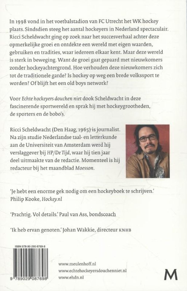 In 1998 vond in het voetbalstadion van FC Utrecht het WK hockey plaats. Sindsdien steeg het aantal hockeyers in Nederland spectaculair. Ricci Scheldwacht ging op zoek naar het verhaal achter deze opmerkelijke groei en ontdekte een wereld met eigen waarden, gebruiken en tradities, waar iedereen elkaar kent. Maar deze wereld is sterk in beweging. Want de groei gaat gepaard met nieuwkomers zonder hockeyachtergrond. Hoe verhouden deze nieuwelingen zich tot de oude traditionele garde? Is hockey op weg een brede volkssport te worden? Of blijft het een old boys network?Voor Echte hockeyers douchen niet dook Scheldwacht in deze fascinerende sportwereld en sprak hij met hockeygrootheden, met de sporters én de bobo’s.