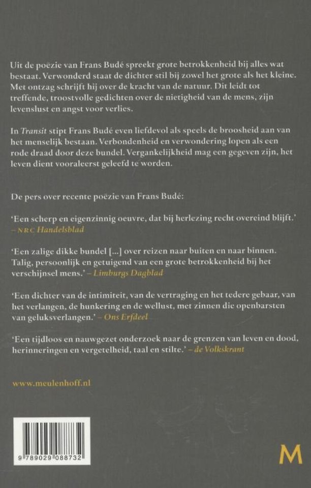 In Transit stipt Frans Budé even liefdevol als speels de broosheid aan van het menselijk bestaan. Verbondenheid en verwondering lopen als een rode draad door deze bundel. Vergankelijkheid mag een gegeven zijn, het leven dient vooraleerst geleefd te worden.