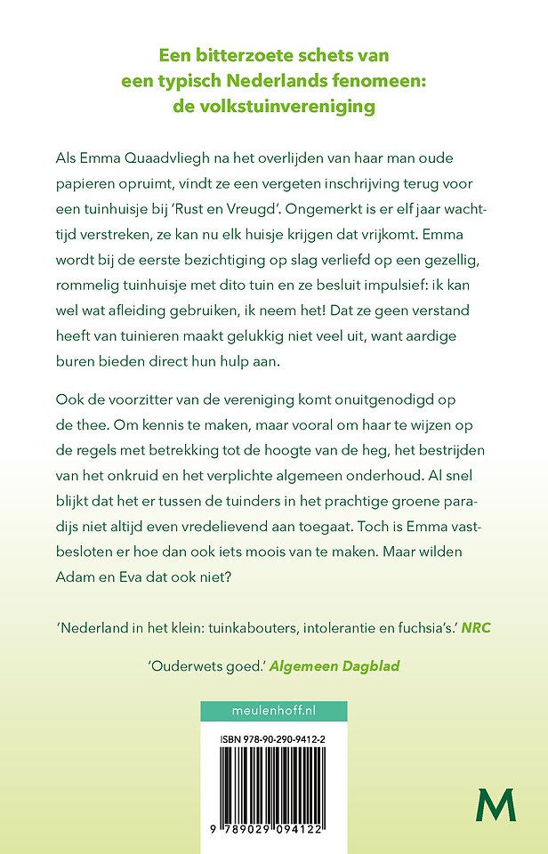Als Emma Quaadvliegh na het overlijden van haar man oude papieren opruimt, vindt ze een vergeten inschrijving terug voor een tuinhuisje bij ‘Rust en Vreugd’. Ongemerkt is er elf jaar wachttijd verstreken, ze kan nu elk huisje krijgen dat vrijkomt. Emma wordt bij de eerste bezichtiging op slag verliefd op een gezellig, rommelig tuinhuisje met dito tuin en ze besluit impulsief: ik kan wel wat afleiding gebruiken, ik neem het! Dat ze geen verstand heeft van tuinieren maakt gelukkig niet veel uit, want aardige buren bieden direct hun hulp aan.