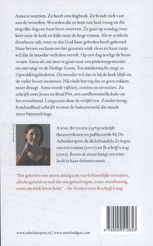 Meer over Anne BüdgenAnna is veertien. Ze heeft een dagboek. Ze houdt zich vast aan de woorden. Woorden die ze kent van heel vroeg en die nog elke dag om haar heen zwerven. Ze gaat op zondag twee keer naar de kerk en kijkt naar de hoge ramen. Als er zonlicht doorheen valt, weet ze dat God haar gebeden heeft gehoord. Haar broers vechten om het grootste stuk vlees en haar zusje wil dat de moeder verhalen vertelt.