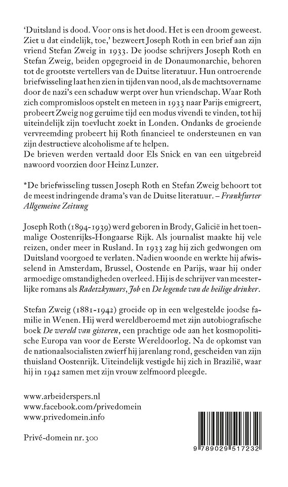 ‘Duitsland is dood. Voor ons is het dood. Het is een droom geweest. Ziet u dat eindelijk, toe,’ bezweert Joseph Roth in een brief aan zijn vriend Stefan Zweig in 1933. De joodse schrijvers Joseph Roth en Stefan Zweig, beiden opgegroeid in de Donaumonarchie, behoren tot de grootste vertellers van de Duitse literatuur. Hun ontroerende briefwisseling laat hen zien in tijden van nood, als de machtsovername door de nazi’s een schaduw werpt over hun vriendschap. Waar Roth zich compromisloos opstelt en meteen in 1933 naar Parijs emigreert, probeert Zweig nog geruime tijd een modus vivendi te vinden, tot hij uiteindelijk zijn toevlucht zoekt in Londen. Ondanks de groeiende vervreemding probeert hij Roth financieel te ondersteunen en van zijn destructieve alcoholisme af te helpen.