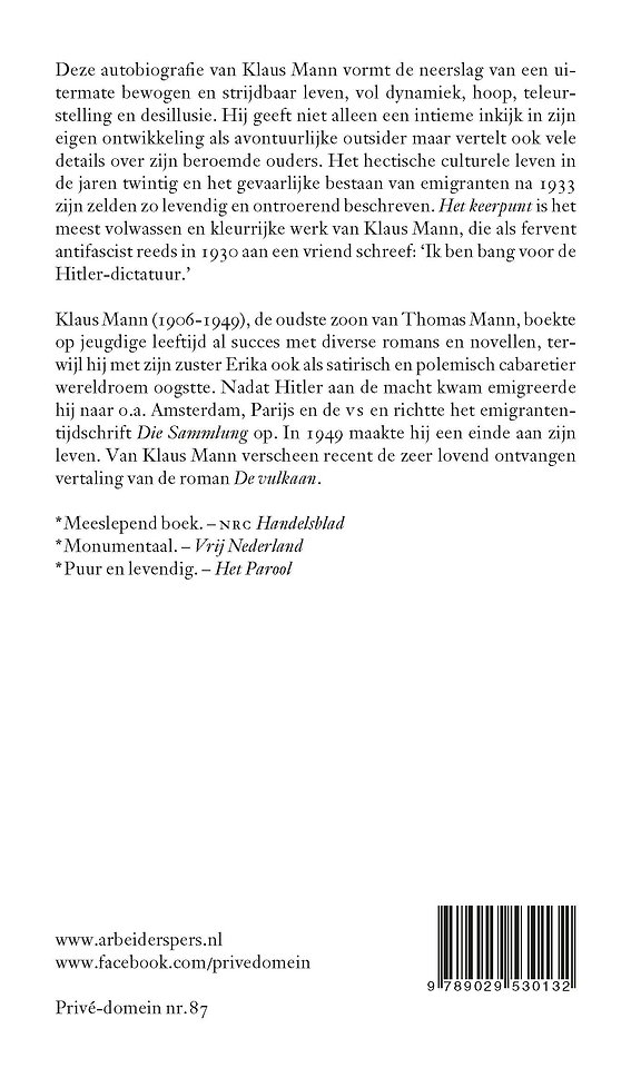 Deze autobiografie van Klaus Mann vormt de neerslag van een uitermate bewogen en strijdbaar leven, vol dynamiek, hoop, teleurstelling en desillusie. Hij geeft niet alleen een intieme inkijk in zijn eigen ontwikkeling als avontuurlijke outsider maar vertelt ook vele details over zijn beroemde ouders. Het hectische culturele leven in de jaren twintig en het gevaarlijke bestaan van emigranten na 1933 zijn zelden zo levendig en ontroerend beschreven. Het keerpunt is het meest volwassen en kleurrijke werk van Klaus Mann, die als fervent antifascist reeds in 1930 aan een vriend schreef: ‘Ik ben bang voor de Hitler-dictatuur.’