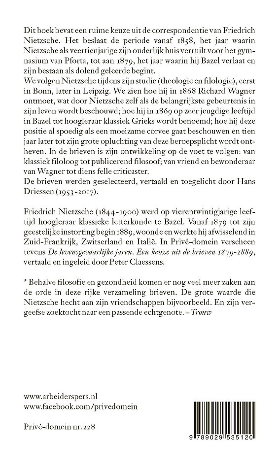 Dit boek bevat een ruime keuze uit de correspondentie van Friedrich Nietzsche. Het beslaat de periode vanaf 1858, het jaar waarin Nietzsche als veertienjarige zijn ouderlijk huis verruilt voor het gymnasium van Pforta, tot aan 1879, het jaar waarin hij Bazel verlaat en zijn bestaan als dolend geleerde begint.