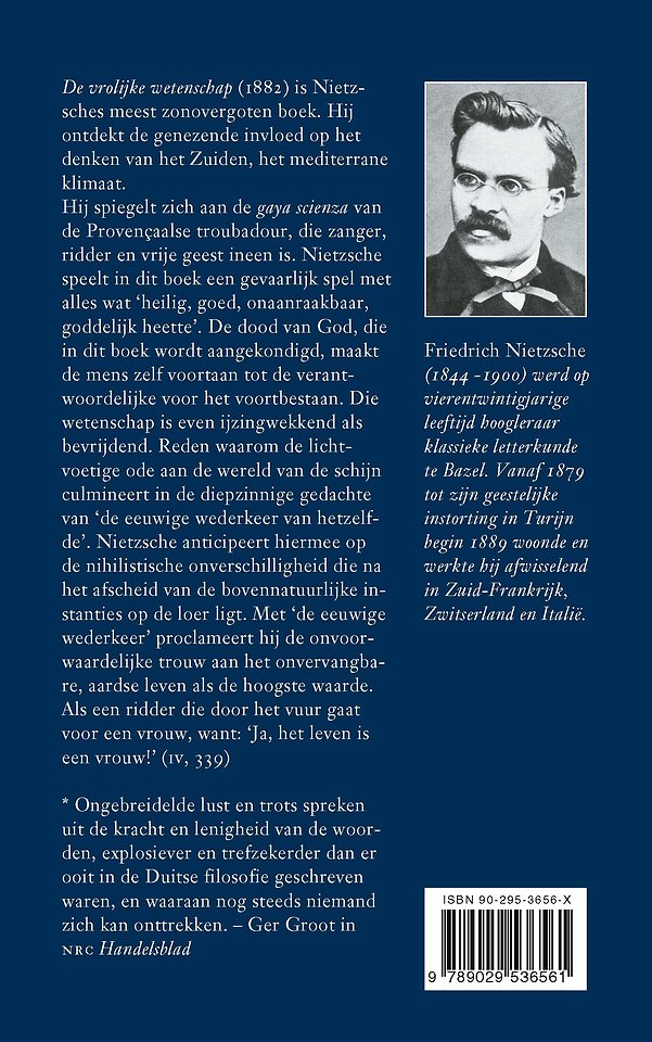 De vrolijke wetenschap (1882) is Nietzsches meest zonovergoten boek. Hij ontdekt de genezende invloed op het denken van het Zuiden, het mediterrane klimaat. Hij spiegelt zich aan de gaya scienza van de Provençaalse troubadour, die zanger, ridder en vrije geest ineen is. Nietzsche speelt in dit boek een gevaarlijk spel met alles wat ‘heilig, goed, onaanraakbaar, goddelijk heette’. De dood van God, die in dit boek wordt aangekondigd, maakt de mens zelf voortaan tot de verantwoordelijke voor het voortbestaan. Die wetenschap is even ijzingwekkend als bevrijdend. Reden waarom de lichtvoetige ode aan de wereld van de schijn culmineert in de diepzinnige gedachte van ‘de eeuwige wederkeer van hetzelfde’. Nietzsche anticipeert hiermee op de nihilistische onverschilligheid die na het afscheid van de bovennatuurlijke instanties op de loer ligt. Met ‘de eeuwige wederkeer’ proclameert hij de onvoorwaardelijke trouw aan het onvervangbare, aardse leven als de hoogste waarde. Als een ridder die door het vuur gaat voor een vrouw, want: ‘Ja, het leven is een vrouw!’ (IV, 339)