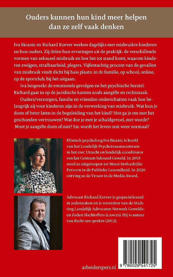 Iva Bicanic en Richard Korver werken dagelijks met misbruikte kinderen en hun ouders. Zij delen hun ervaringen uit de praktijk: de verschillende vormen van seksueel misbruik en hoe het tot stand komt, waarom kinderen zwijgen, strafbaarheid, plegers. Vijfentachtig procent van de gevallen van misbruik vindt dicht bij huis plaats: in de familie, op school, online, op de sportclub, bij het uitgaan.
