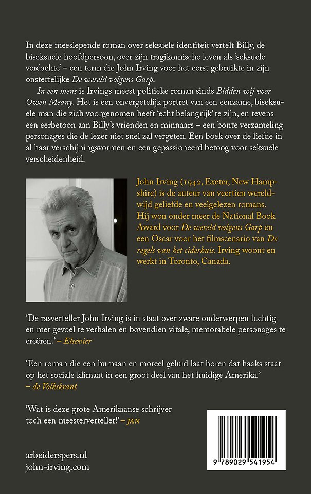 In een mens is Irvings meest politieke roman sinds Bidden wij voor Owen Meany. Het is een onvergetelijke portret van een eenzame, biseksuele man die zich voorgenomen heeft ‘echt belangrijk’ te zijn, en tevens een eerbetoon aan Billy’s vrienden en minnaars – een bonte verzameling personages die de lezer niet snel zal vergeten. Een boek over de liefde in al haar verschijningsvormen en een gepassioneerd betoog voor seksuele verscheidenheid.