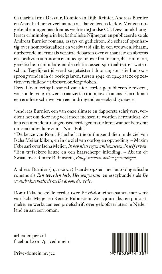 Catharina Irma Dessaur, Ronnie van Dijk, Atara, Reinier of Andreas Burnier heeft net zoveel namen als dat ze levens leidde. Met een ongekende honger naar kennis werkte de Joodse Burnier als hoogleraar criminologie in het katholieke Nijmegen en publiceerde ze als romancier, essayist en dichter. Ze schreef openhartig over homoseksualiteit en verdwaald zijn in een vrouwenlichaam, ontketende meermaals verhitte debatten over euthanasie en abortus en sprak zich autonoom en moedig uit over feminisme, discriminatie, genetische manipulatie en de relatie tussen spiritualiteit en wetenschap. Tegelijkertijd werd Burnier geteisterd door angsten die hun oorsprong vonden in de oorlogsjaren: tussen 1942 en 1945 zat ze op zestien verschillende adressen ondergedoken.