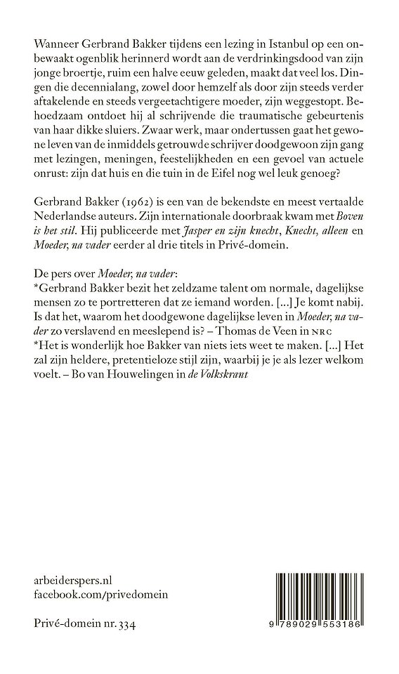 Wanneer Gerbrand Bakker tijdens een lezing in Istanbul op een onbewaakt ogenblik herinnerd wordt aan de verdrinkingsdood van zijn jonge broertje, ruim een halve eeuw geleden, maakt dat veel los. Dingen die decennialang, zowel door hemzelf als door zijn steeds verder aftakelende en steeds vergeetachtigere moeder, zijn weggestopt. Behoedzaam ontdoet hij al schrijvende die traumatische gebeurtenis van haar dikke sluiers. Zwaar werk, maar ondertussen gaat het gewone leven van de inmiddels getrouwde schrijver doodgewoon zijn gang met lezingen, meningen, feestelijkheden en een gevoel van actuele onrust: zijn dat huis en die tuin in de Eifel nog wel leuk genoeg?