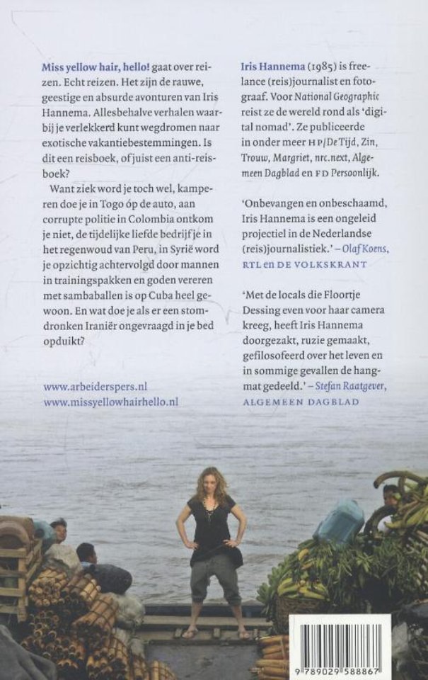 Miss yellow hair, hello! gaat over reizen. Écht reizen. Het zijn de rauwe, geestige en absurde avonturen van reisjournaliste en wereldreizigster Iris Hannema. Geen reisverhalen waarbij je verlekkerd kunt wegdromen naar exotische vakantiebestemmingen. Want ziek word je toch wel, kamperen doe je in Benin óp de auto, aan corrupte politie in Colombia ontkom je niet, de tijdelijke liefde bedrijf je in Iran midden in de woestijn, en goden vereren met sambaballen is op Cuba heel gewoon. Als je niet van plan bent zelf op reis te gaan, geeft dit boek alle reden om thuis te blijven.
