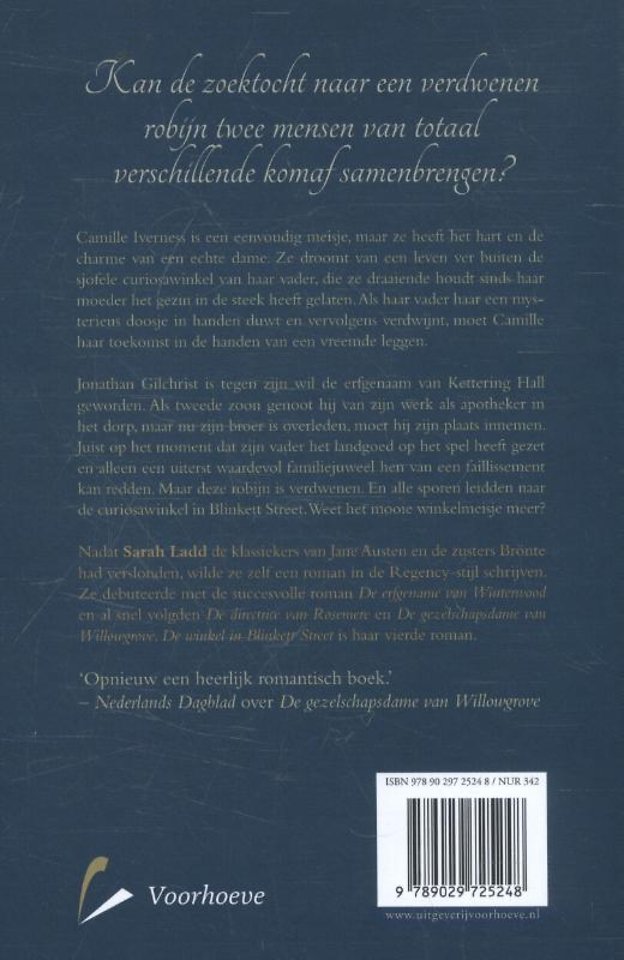 Camille Iverness is een eenvoudig winkelmeisje, maar ze heeft het hart en de charme van een echte dame. Sinds haar moeder hun in de steek heeft gelaten, zorgt ze voor haar familie en houdt ze hun sjofele curiositeitenwinkel draaiende. Maar een verraderlijke daad gooit roet in het eten en dwingt Camille haar toekomst in de handen van een vreemde te leggen. Jonathan Gilchrist is tegen zijn wil in de erfgenaam van Kettering Hall geworden. Als tweede zoon genoot hij van zijn werk als apotheker in het dorp, maar nu zijn broer is overleden, moet hij zijn plaats innemen. Juist op het moment dat zijn vader het landgoed op het spel heeft gezet en alleen een uiterst waardevol familiejuweel hen van een faillissement kan redden. Maar deze robijn is verdwenen. En alle sporen leidden naar de Iverness curiositeitenwinkel in Blinkett Street. Weet het mooie winkelmeisje meer Sarah Ladd schrijft net als Julie Klassen historische romans die zich afspelen in de Regency-periode in Engeland