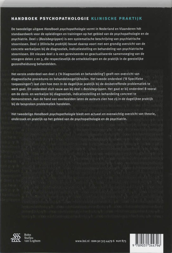 De tweedelige uitgave Handboek psychopathologie vormt in Nederland en Vlaanderen hét standaardwerk voor de opleidingen en trainingen op het gebied van de psychopathologie en de psychiatrie. Deel 1 (Basisbegrippen) is een systematische beschrijving van psychiatrische stoornissen. Deel 2 (Klinische praktijk) bouwt daarop voort met een grondig overzicht van de concrete werkwijzen bij de diagnostiek, indicatiestelling en behandeling van psychiatrische stoornissen. Dit nieuwe deel 2 is een gereviseerde en geactualiseerde samenvoeging van de vroegere delen 2 en 3, die respectievelijk de ontwikkelingen en de praktijk in de geestelijke gezondheidszorg behandelden.