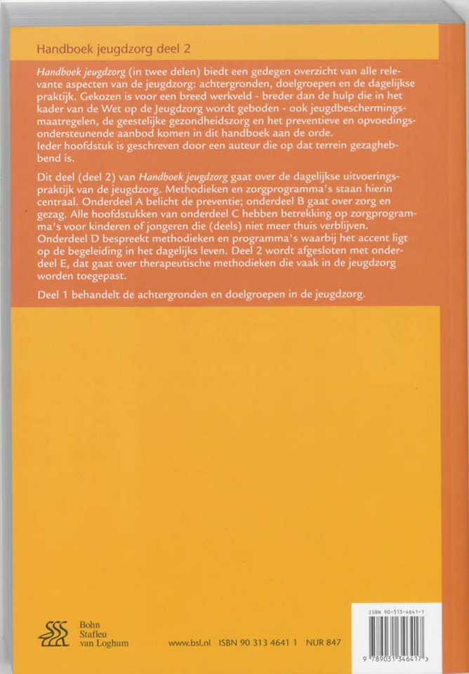 Dit deel (deel 2) van Handboek jeugdzorg gaat over de dagelijkse uitvoeringspraktijk van de jeugdzorg. Methodieken en zorgprogramma's staan hierin centraal. Onderdeel A belicht de preventie; onderdeel B gaat over zorg en gezag. Alle hoofdstukken van onderdeel C hebben betrekking op zorgprogramma's voor kinderen of jongeren die (deels) niet meer thuis verblijven. Onderdeel D bespreekt methodieken en programma's waarbij het accent ligt op de begeleiding in het dagelijks leven. Deel 2 wordt afgesloten met onderdeel E, dat gaat over therapeutische methodieken die vaak in de jeugdzorg worden toegepast.