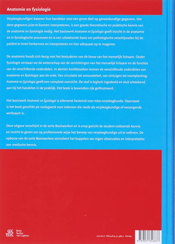 Verpleegkundigen baseren hun handelen grotendeels op geneeskundige gegevens. Om deze gegevens juist te kunnen interpreteren, is een goede theoretische en praktische kennis van de anatomie en fysiologie nodig. Het basiswerk Anatomie en fysiologie geeft inzicht in de anatomie en in fysiologische processen, en is een uitstekende basis om pathologische verschijnselen bij de patiënt te leren herkennen, interpreteren en hier adequaat op te reageren.