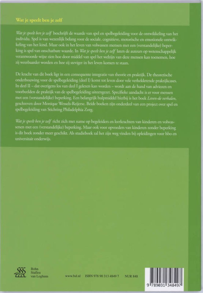 Wat je speelt ben je zelf beschrijft de waarde van spel en spelbegeleiding voor de ontwikkeling van het individu. Spel is van wezenlijk belang voor de sociale, cognitieve, motorische en emotionele ontwikkeling van het kind. Maar ook voor volwassen mensen met een (verstandelijke) beperking is spel van onschatbare waarde.