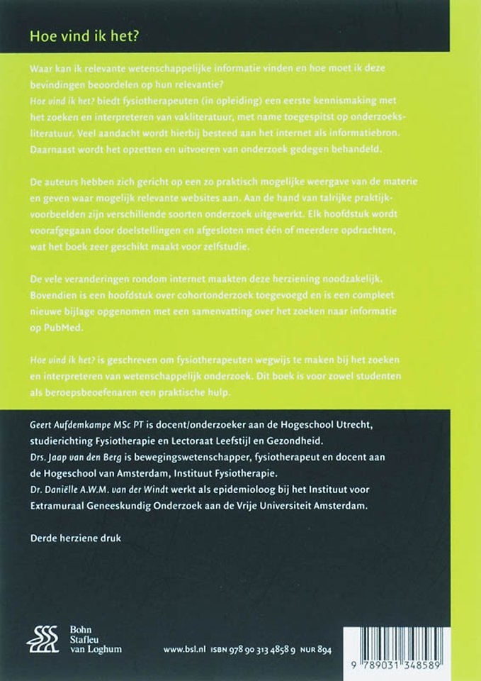 Waar kan ik relevante wetenschappelijke informatie vinden en hoe moet ik deze bevindingen beoordelen op hun relevantie?Hoe vind ik het? biedt fysiotherapeuten (in opleiding) een eerste kennismaking met het zoeken en interpreteren van vakliteratuur, met name toegespitst op onderzoekesliteratuur.Veel aandacht wordt hierbij besteed aan het internet als informatiebron. Daarnaast wordt het opzetten en uitvoeren van onderzoek gedegen behandeld.De auteurs hebben zich gericht op een zo praktisch mogelijke weergave van de materie en gevem waar ,mogelijk relevante websites aan. Aan de hand van talrijke praktijkvoorbeelden zijn verschillende soorten onderzoek uitgewerkt. Elk hoofdstuk wordt voorafgegaan door doelstellingen en afgesloten met of meerdere opdrachten, wat het boek zeer geschikt maakt voor zelfstudie.De auteurs hebben zich gericht op een zo praktisch mogelijke weergave van de materie en gevem waar ,mogelijk relevante websites aan. Aan de hand van talrijke praktijkvoorbeelden zijn verschillende soorten onderzoek uitgewerkt. Elk hoofdstuk wordt voorafgegaan door doelstellingen en afgesloten met of meerdere opdrachten, wat het boek zeer geschikt maakt voor zelfstudie.De vele veranderingen rondom internet maakten deze herziening noodzakelijk. Bovendien is een hoofdstuk over cohortonderzoek toegevoegd en is een compleet nieuwe bijlage opgenomen met een samenvatting over het zoeken naar informatie op PubMed.