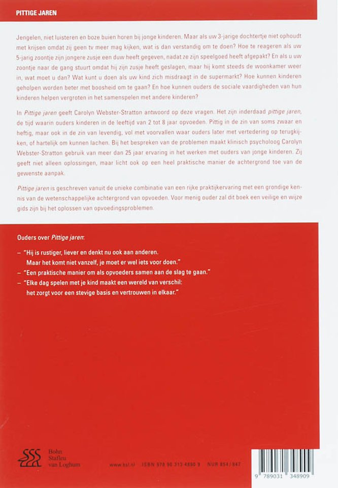 In Pittige jaren geeft Carolyn Webster-Stratton antwoord op deze vragen. Het zijn inderdaad pittige jaren, de tijd waarin ouders kinderen in de leeftijd van 2 tot 8 jaar opvoeden. Pittig in de zin van soms zwaar en heftig, maar ook in de zin van levendig, vol met voorvallen waar ouders later met vertedering op terugkijken, of hartelijk om kunnen lachen, Bij het bespreken van de problemen maakt klinisch psycholoog Carolyn Webster-Stratton gebruik van meer dan 25 jaar ervaring in het werken met ouders van jonge kinderen. Zij geeft niet alleen oplossingen, maar licht ook op een heel praktische manier de achtergrond toe van de gewenste aanpak.