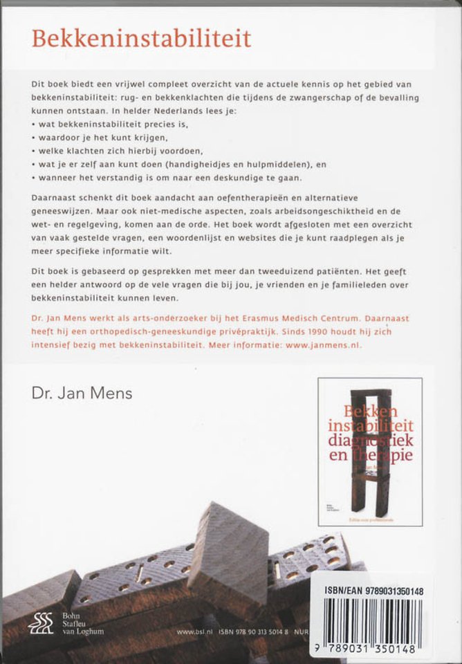 Dit boek biedt een vrijwel compleet overzicht van de actuele kennis op het gebied van bekkeninstabiliteit: rug– en bekkenklachten die tijdens de zwangerschap of de bevalling kunnen ontstaan. In heldere bewoordingen lees je: wat bekkeninstabiliteit precies is, waardoor je het kunt krijgen, welke klachten zich hierbij voordoen, wat je er zelf aan kunt doen (handigheidjes en hulpmiddelen), wanneer het verstandig is om naar een deskundige te gaan.