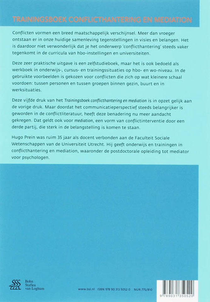Deze vijfde druk van het 'Trainingsboek conflicthantering en mediation' is in opzet gelijk aan de vorige druk. Maar doordat het communicatieperspectief steeds belangrijker is geworden in de conflictliteratuur, heeft dit nu meer aandacht gekregen. Dat geldt ook voor mediation, een vorm van conflictinterventie door een derde partij, die sterk in de belangstelling is komen te staan.