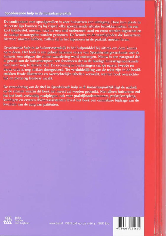 De verandering van de titel in Spoedeisende hulp in de huisartspraktijk legt de nadruk op de situatie waarin dit boek het meest zal worden gebruikt. Niet alleen huisartsen zullen het boek veelvuldig raadplegen, ook voor praktijkondersteuners, praktijkverpleegkundigen en ervaren doktersassistenten levert het boek een onmisbare bijdrage aan de kwaliteit van de zorg aan patiënten.