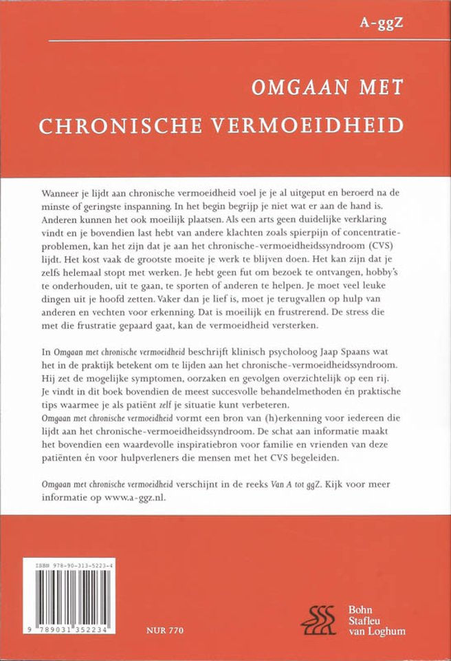 Wanneer je lijdt aan chronische vermoeidheid voel je je al uitgeput en beroerd na de minste geringste inspanning. In het begin begrijp je niet wat er aan de hand is. Anderen kunnen het ook moeilijk plaatsten. Als een arts geen duidelijke medische verklaring vindt en je bovendien last hebt van andere klachten zoals spierpijn of concentratieproblemen kan het zijn dat je aan het chronisch vermoeidheidssyndroom (CVS) lijdt.Deze aandoening zet je leven op zijn kop. Het kost vaak de grootste moeite je werk te blijven doen. Het kan zijn dat je zelfs helemaal stopt met werken. Je hebt geen fut om bezoek te ontvangen, hobby's te onderhouden, uit te gaan, te sporten of anderen te helpen. Je moet veel leuke dingen uit je hoofd zetten. Vaker dan je lief is, moet je terugvallen op hulp van anderen en vechten voor erkenning. Dat is moeilijk en frustrerend. De stress die met die frustratie gepaard gaat, kan de vermoeidheid versterken.In Omgaan met chronische vermoeidheid beschrijft klinisch psycholoog Jaap Spaans wat het in de praktijk betekent om te lijden aan het chronisch vermoeidheidssyndroom. Hij zet de mogelijke symptomen, oorzaken en gevolgen overzichtelijk op een rij. Je vindt in dit boek bovendien de meest succesvolle behandelmethoden én praktische tips waarmee je als patiënt zelf je situatie kunt verbeteren.