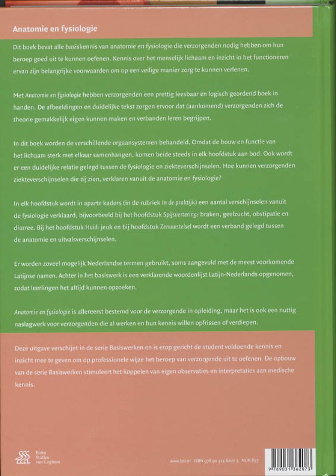 Dit boek bevat alle basiskennis van anatomie en fysiologie die verzorgenden nodig hebben om hun beroep goed uit te kunnen oefenen. Kennis over het menselijk lichaam en inzicht in het functioneren ervan zijn belangrijke voorwaarden om op een veilige manier zorg te kunnen verlenen.