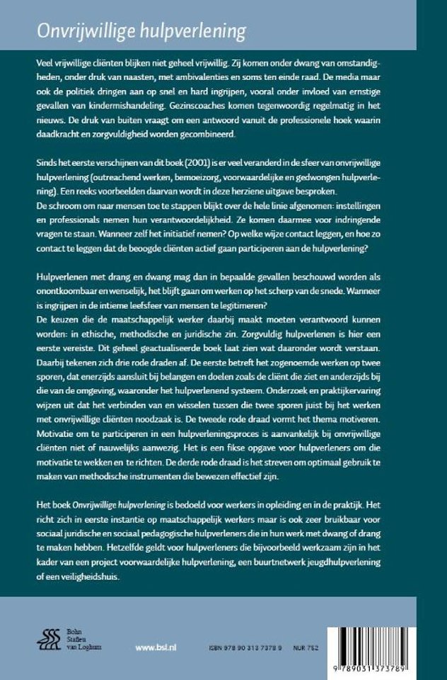 De keuzen die de maatschappelijk werker daarbij maakt moeten verantwoord kunnen worden: in ethische, methodische en juridische zin. Zorgvuldig hulpverlenen is hier een eerste vereiste. Dit geheel geactualiseerde boek laat zien wat daaronder wordt verstaan. Daarbij tekenen zich drie rode draden af. De eerste betreft het zogenoemde werken op twee sporen, dat enerzijds aansluit bij belangen en doelen zoals de cliënt die ziet en anderzijds bij die van de omgeving, waaronder het hulpverlenend systeem. Onderzoek en praktijkervaring wijzen uit dat het verbinden van en wisselen tussen die twee sporen juist bij het werken met onvrijwillige cliënten noodzaak is. De tweede rode draad vormt het thema motiveren. Motivatie om te participeren in een hulpverleningsproces is aanvankelijk bij onvrijwillige cliënten niet of nauwelijks aanwezig. Het is een fikse opgave voor hulpverleners om die motivatie te wekken en te richten. De derde rode draad is het streven om optimaal gebruik te maken van methodische instrumenten die bewezen effectief zijn.