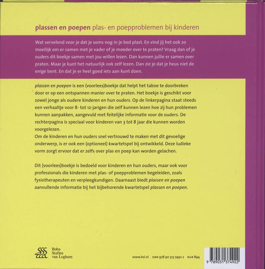 Zindelijk worden en blijven is een ingewikkeld proces dat soms tot klachten kan leiden, zoals bedplassen, plasverlies overdag, gevoel van blaasontsteking, poepverlies, obstipatie of niet op de wc plassen of poepen. Dit kan stress en spanning veroorzaken bij het kind en irritatie, ongeduld en onbegrip bij ouders, familie en school.Dit (voorlees)boekje (incl. A4 poster) maakt problemen rond plassen en poepen weer bespreekbaar door er op een ontspannen manier over te praten en door te mogen lachen om het eigen en andermans plas- en poepverhaal. Het boekje is geschikt voor zowel jonge als oudere kinderen en hun ouders. Op de linkerpagina staat steeds een verhaaltje voor 8- tot 12-jarigen die zelf kunnen lezen hoe zij hun problemen kunnen aanpakken, aangevuld met feitelijke informatie voor de ouders. De rechterpagina is speciaal voor kinderen van 3 tot 8 jaar die kunnen worden voorgelezen.