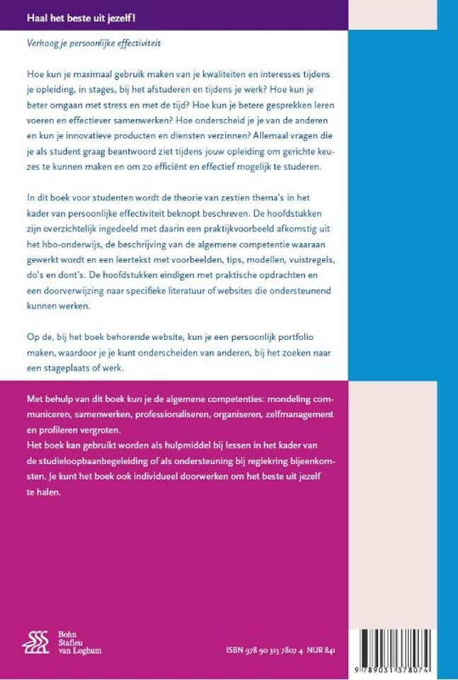 In dit boek voor studenten wordt de theorie van acht thema’s in het kader van persoonlijke effectiviteit beknopt beschreven. De hoofdstukken zijn overzichtelijk ingedeeld met daarin een praktijkvoorbeeld afkomstig uit het hbo, de beschrijving van de algemene competentie waaraan gewerkt wordt en een leertekst met voorbeelden, tips, modellen, vuistregels, do’s en don’ts. De hoofdstukken eindigen met praktische opdrachten en een doorverwijzing naar specifieke literatuur of websites die ondersteunend kunnen werken.