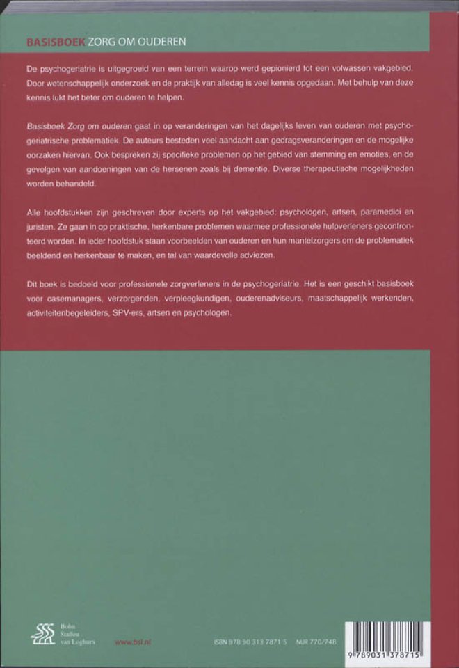 Basisboek Zorg om ouderen is bedoeld voor professionele zorgverleners in de psychogeriatrie. Het is een geschikt basisboek voor casemanagers, verzorgenden, verpleegkundigen, ouderenadviseurs, maatschappelijk werkenden, activiteitenbegeleiders, SPV-ers, artsen en psychologen.