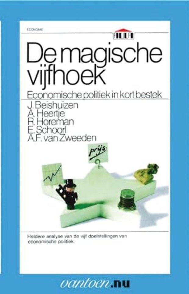 De magische vijfhoek;is een begrip uit de economische politiek. Het staat voor de vijf doelstellingen: evenwichtige arbeidsmarkt, economische groei, stabiele prijzen, redelijke inkomensverdeling en evenwicht op de betalingsbalans. Het boek is geschreven voor de economisch geinteresseerde krantenlezer. Het geeft een goed inzicht in de betekenis van de begrippen en de problemen die ermee samenhangen, ongeacht de politieke visie van waaruit men deze doelstelling probeert te realiseren. Vijf auteurs hebben elkaar in De magische vijfhoek gevonden, twee uit de academische sfeer: prof A. Heertje (hoogleraar in de economie aan de universiteit van Amsterdam) en E. Schoorl (wetenschappelijk medewerker aan diezelfde universiteit); en drie dagbladjournalisten: J. Beishuizen (Het Parool), R. Horeman (De Volkskrant) en A.F. van Zweeden (NRC/Handelsblad). Deze voor Nederland unieke samenwerking heeft geleid tot een bijzonder heldere en leesbare uiteenzetting.