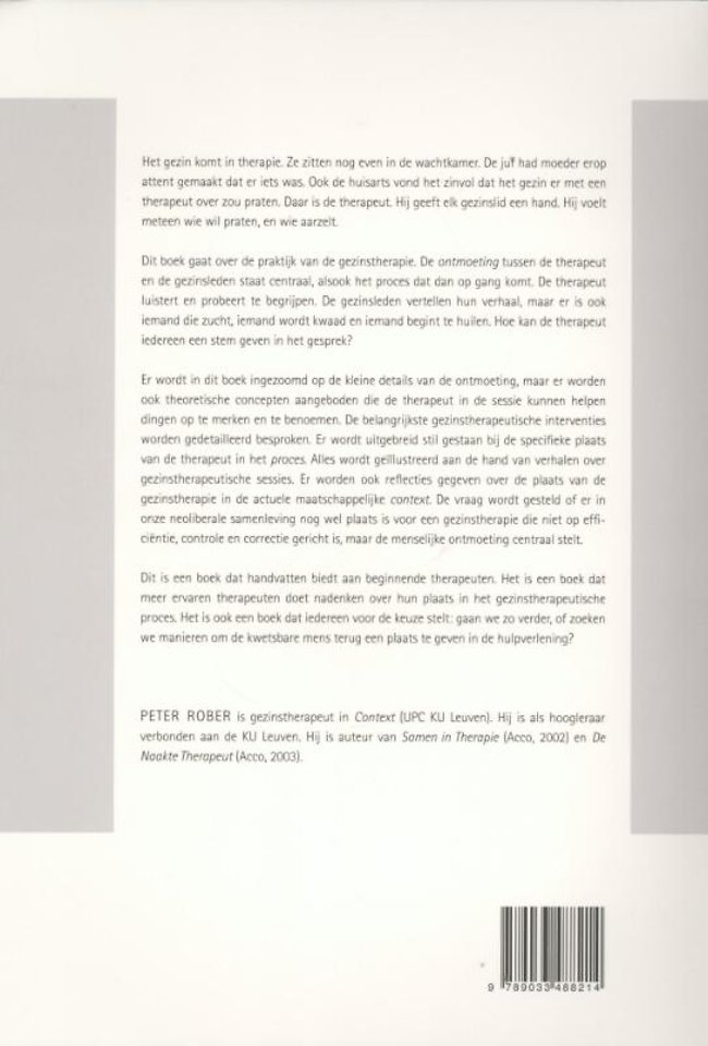 Dit boek gaat over de praktijk van de gezinstherapie. De ontmoeting tussen de therapeut en de gezinsleden staat centraal, alsook het proces dat dan op gang komt. De therapeut luistert en probeert te begrijpen. De gezinsleden vertellen hun verhaal, maar er is ook iemand die zucht, iemand wordt kwaad en iemand begint te huilen. Hoe kan de therapeut iedereen een stem geven in het gesprek? Er wordt in dit boek ingezoomd op de kleine details van de ontmoeting, maar er worden ook theoretische concepten aangeboden die de therapeut in de sessie kunnen helpen dingen op te merken en te benoemen. De belangrijkste gezinstherapeutische interventies worden gedetailleerd besproken. Er wordt uitgebreid stil gestaan bij de specifi eke plaats van de therapeut in het proces. Alles wordt geïllustreerd aan de hand van verhalen over gezinstherapeutische sessies. Er worden ook refl ecties gegeven over de plaats van de gezinstherapie in de actuele maatschappelijke context. De vraag wordt gesteld of er in onze neoliberale samenleving nog wel plaats is voor een gezinstherapie die niet op effi ciëntie, controle en correctie gericht is, maar de menselijke ontmoeting centraal stelt. Dit is een boek dat handvatten biedt aan beginnende en meer ervaren therapeuten.